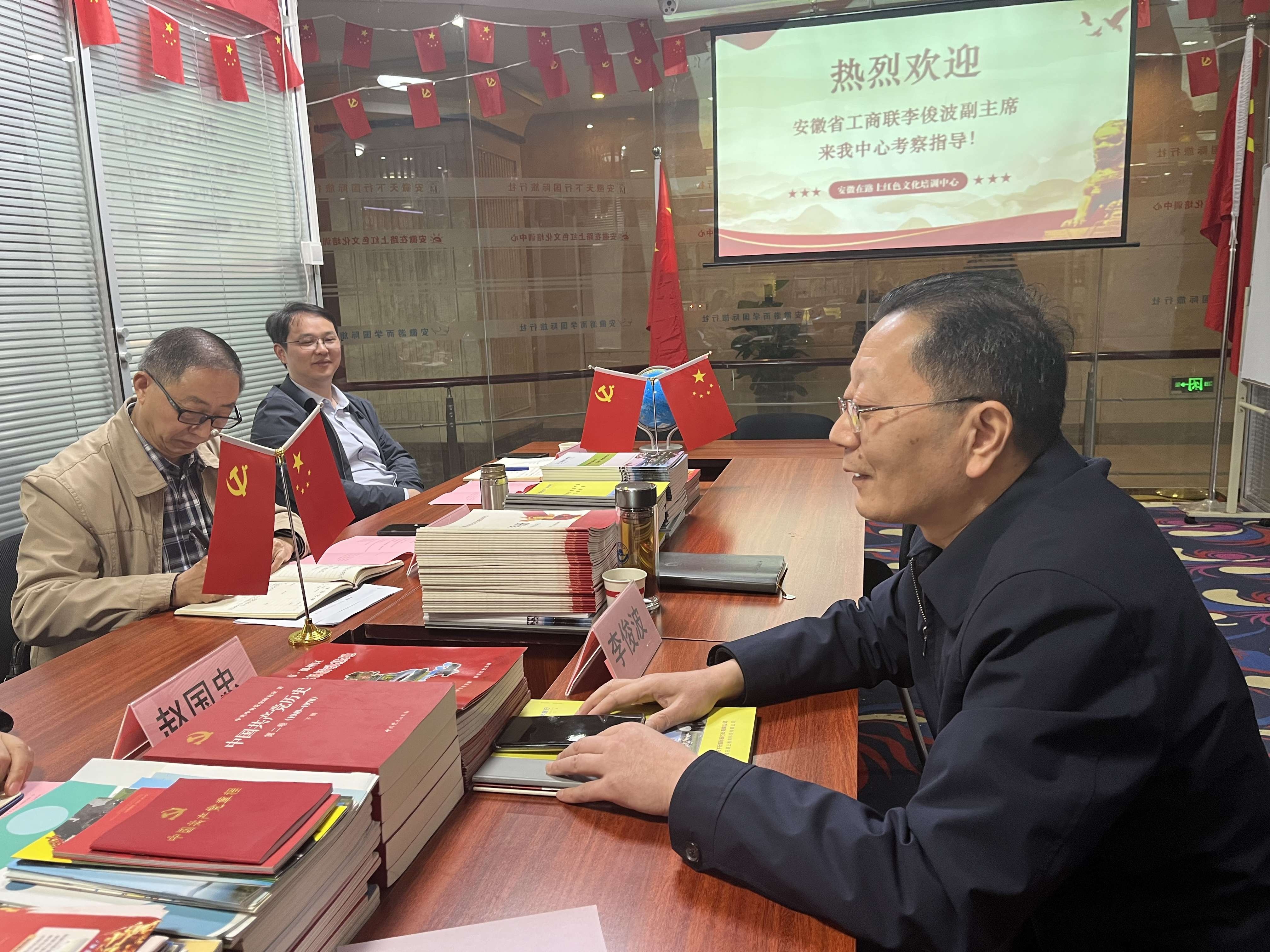 中心执行主任吴文才介绍公司总体情况并播放中心宣传短视频。安徽在路上红色文化培训中心,是一家为了迎接中国共产党成立100周年经相关党政机关批准设立,面向省内外党政机关、企事业单位、大专院校专门开展全国红色文化培训的专业机构,为合肥市委党校“现场教学”入库单位。主要从事党政机关、企事业单位、社会团体以党建为主题的各类培训班,以及中小学生研学旅行为主题的教育培训工作。