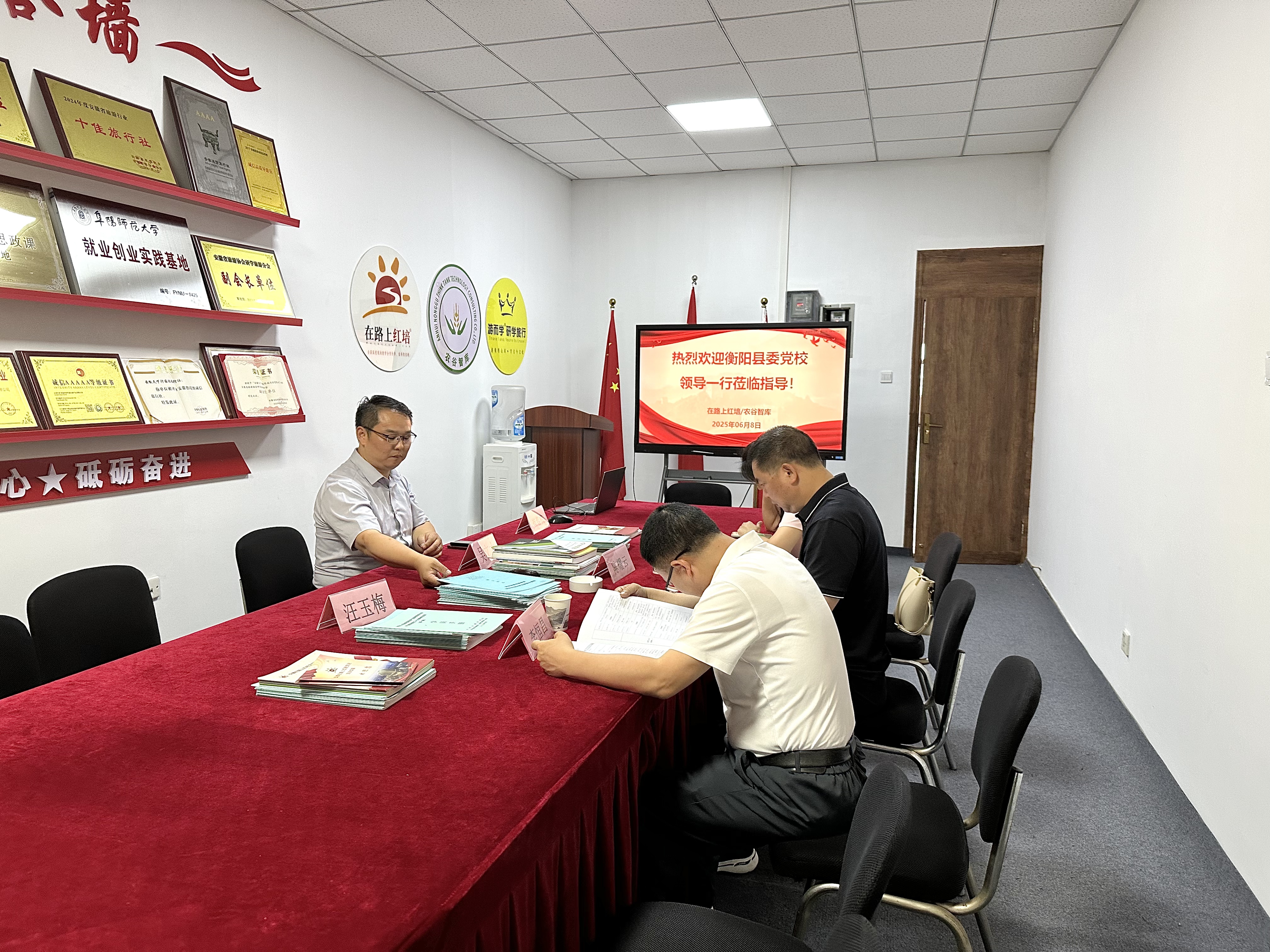 6月8日,衡阳县委党校常委副校长陈耀云、工会主席李恒昌,肖璐老师一行莅临安徽在路上红色文化培训中心参观指导,双方围绕红色教育与科技创新融合发展方向,就合作办学、异地教学等议题展开深入探讨。